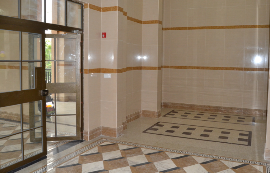35栋的入户大门墙面瓷砖闪亮,奢华大气显风姿,阔景飘窗一片绿色映入眼帘,屋外墙转格外显眼。